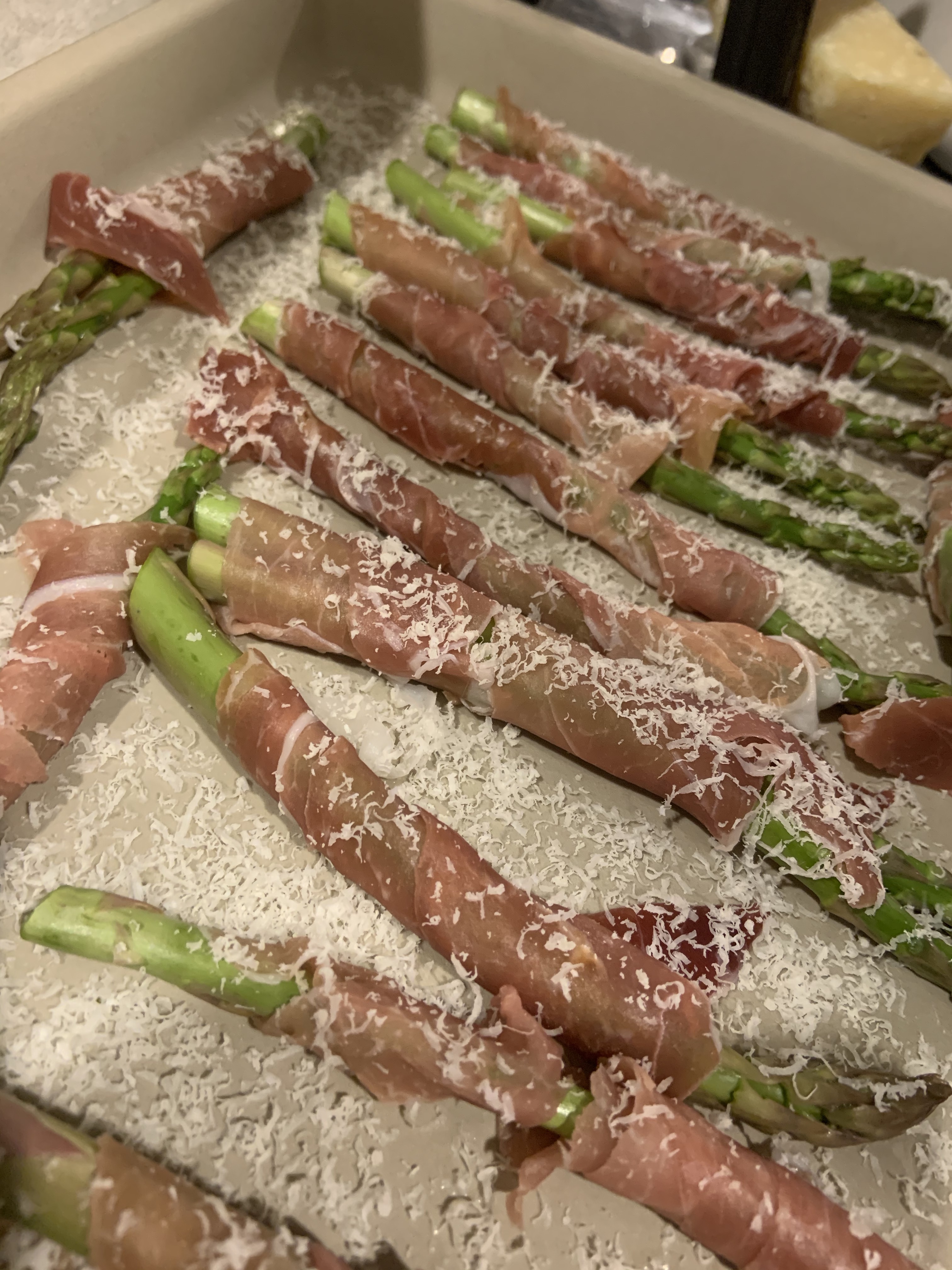 Take one bunch of asparagus. I use organic because they seem to be thinner than the conventional asparagus, which can be really thick and somewhat chewier. Separate a slice of prosciutto – it pulls apart at the fat seams, so it’s workable. Wrap prosciutto around asparagus from bottom to just before the top in a diagonal formation. Checkout out the facebook live video to see how: https://www.facebook.com/1001484664/videos/10220541772626586/?extid=k0incpVxSQikeHkU.