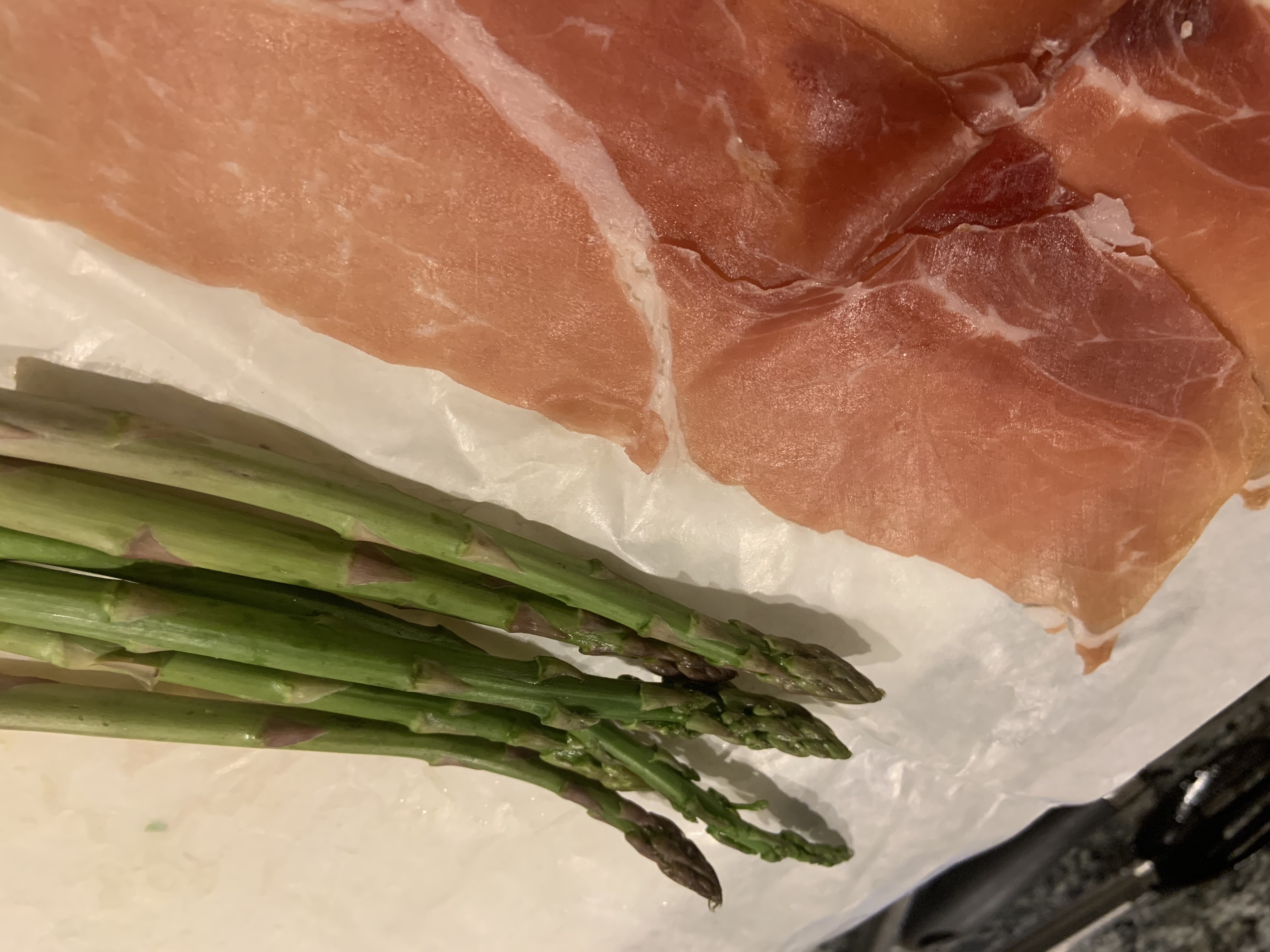 Take one bunch of asparagus. I use organic because they seem to be thinner than the conventional asparagus, which can be really thick and somewhat chewier. Separate a slice of prosciutto – it pulls apart at the fat seams, so it’s workable. Wrap prosciutto around asparagus from bottom to just before the top in a diagonal formation. Checkout out the facebook live video to see how: https://www.facebook.com/1001484664/videos/10220541772626586/?extid=k0incpVxSQikeHkU.