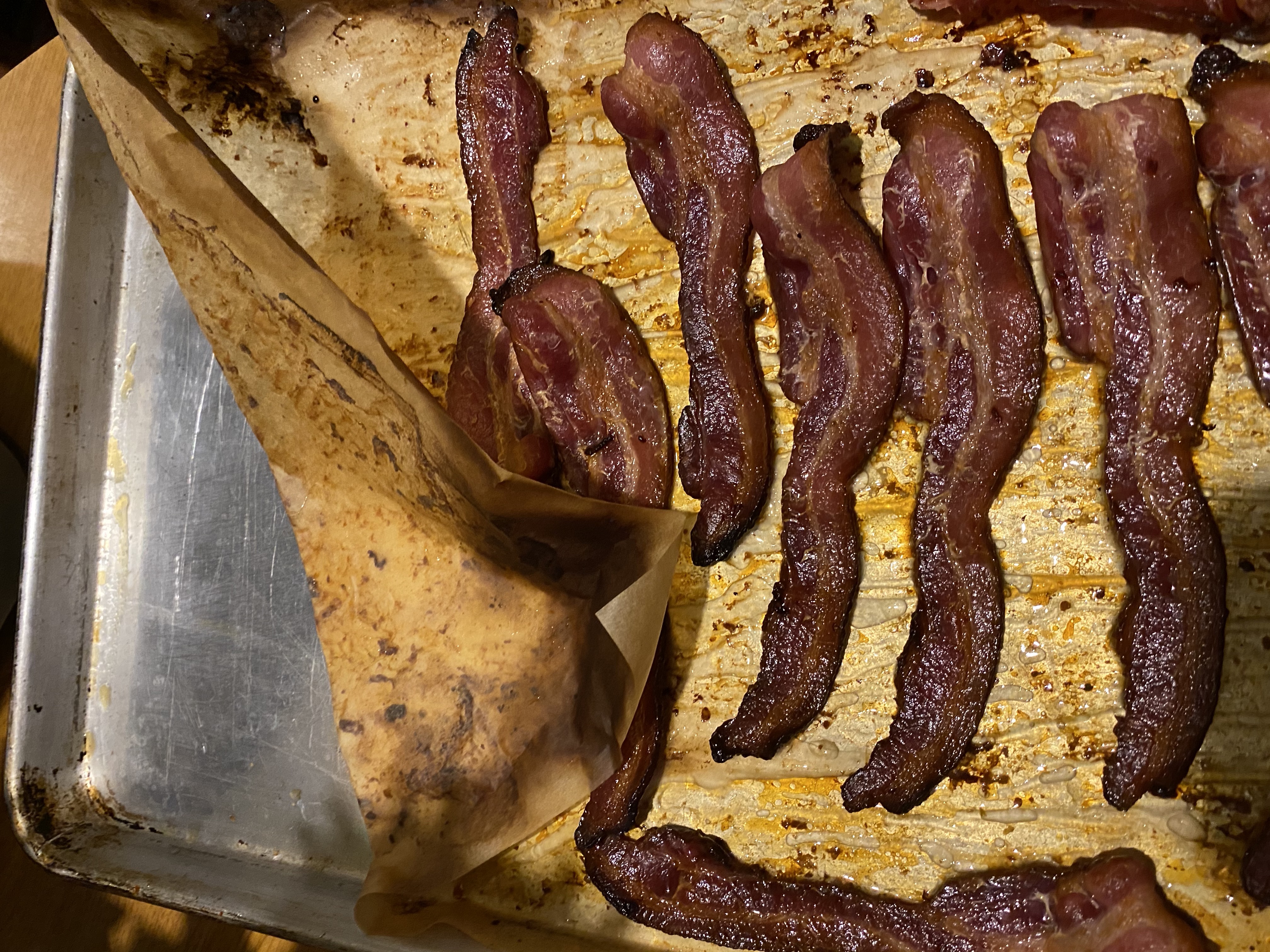 As I continued through the store, I happened upon the refrigerated items. They carried applewood smoked bacon. Another one of my favorites. This brought to mind the BLT on ciabatta from the original Flour Bakery in Downtown Boston. My goodness – it was all coming back to me. All the great eateries – oh boy! This is something I really miss. (TIP: When cooking bacon, use parchment paper for a lining on a cookie sheet – this way you have no mess to clean up and pans to scrub).