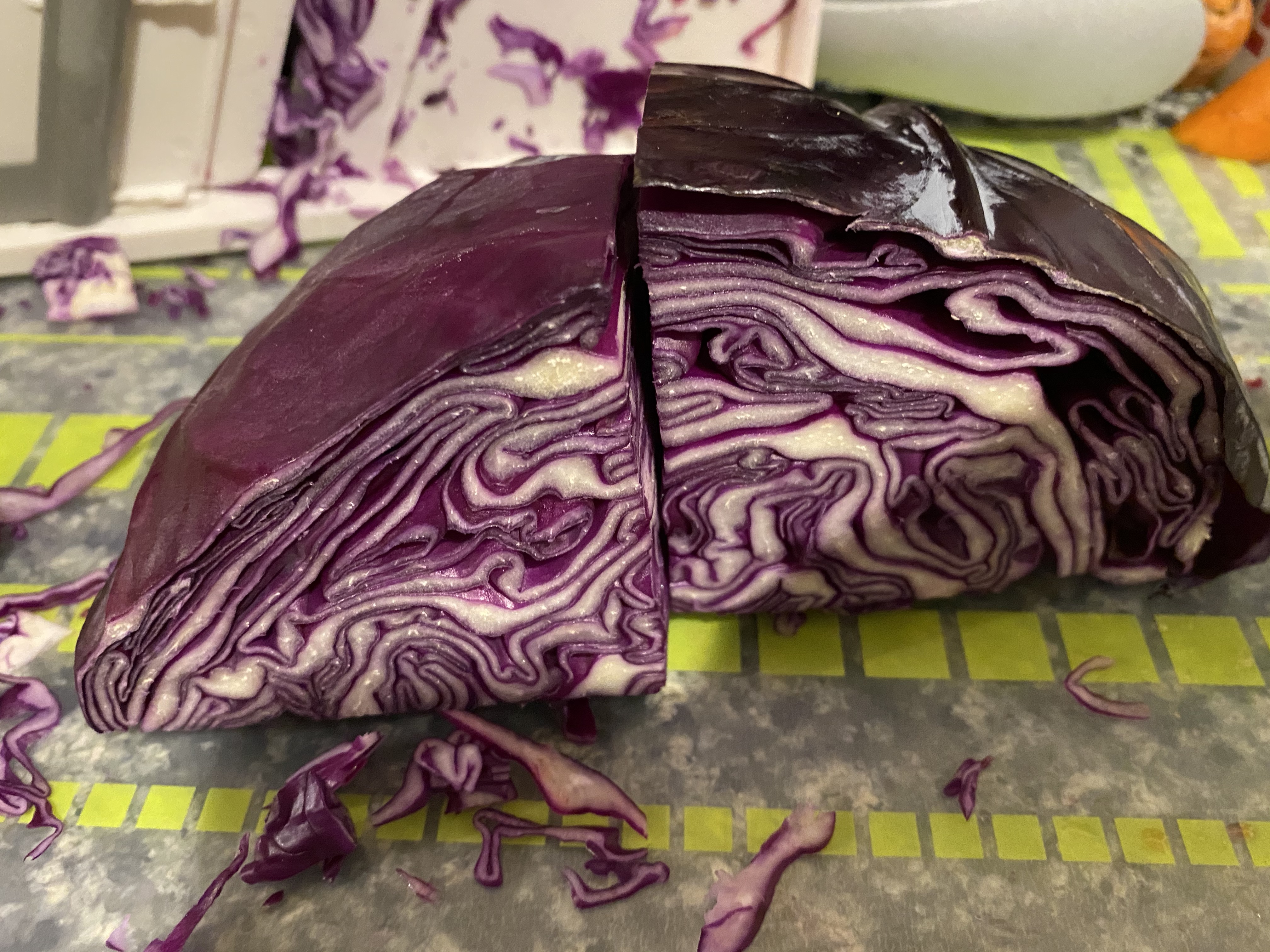 Imagine eight of these. I had to cut the cabbage head into eight sections in order to shred it on my mandolin, it was so big.