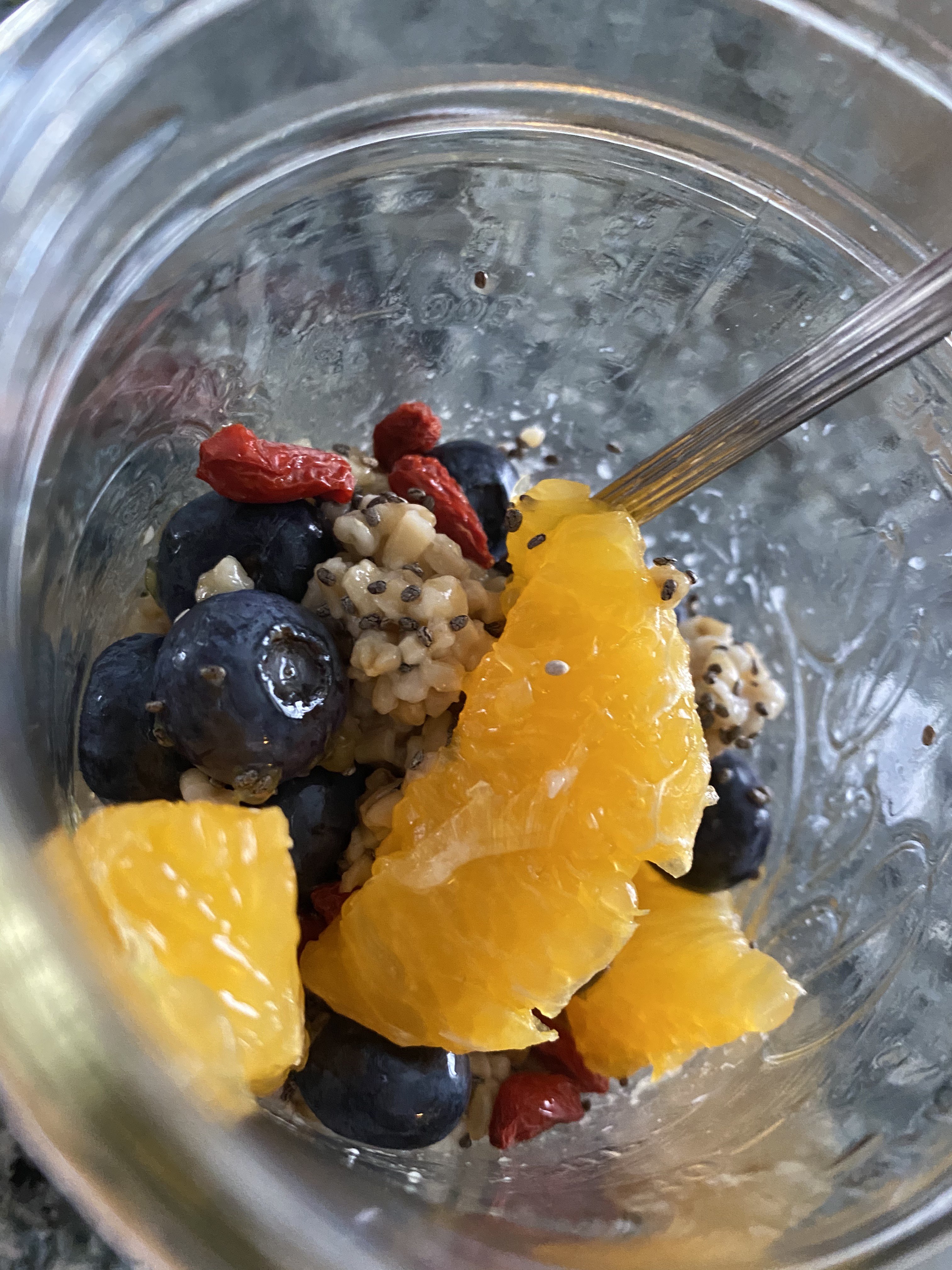 I saw another video with their daughter making this same concoction – oatmeal bowl again!! This time, I said, “I’m gonna do it!” It looks so tasty, but I knew I won’t like the mushy oatmeal. I grabbed my stone ground oatmeal, cooked a half a cup stone ground oatmeal with one cup of water. I let is sit inside the fridge until it was cold. I added fresh blueberries and slices of mandarin oranges to it, a little maple syrup, some chia seeds, and hemp hearts, goji berries, and a tablespoon of crunch almond butter. I didn’t put any almond milk in it, but could have. Best oatmeal I’ve ever had. It was crunchy, nutty, hearty, flavorful and just the right blend of everything. Try it!!