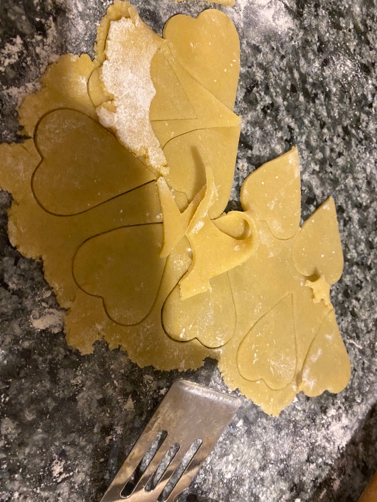 On a well floured board, or countertop (I like to use my granite island since it’s nice and cold, and as long as it is cleaned off thoroughly, its fine to work on) roll out the dough until it is 1/3 inch thick. Cut into shapes and set on cookie sheet – well enough apart so that they don’t cook together (I usually give it about an inch, but then risk it if I want to back in less intervals).